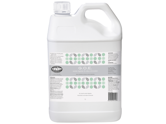 GOE is a natural waste digester, biocatalyst and an odour eliminator. Main applications include drains, septic systems and holding ponds. It is also suitable for use in the following industries and applications: food processing, waste management, dog kennels, portable toilets, agriculture, hospitality and hospitals. It contains natural occurring enzymes, polysaccharides and electrolytes combined with natural citrus extracts and coconut-based surfactants.