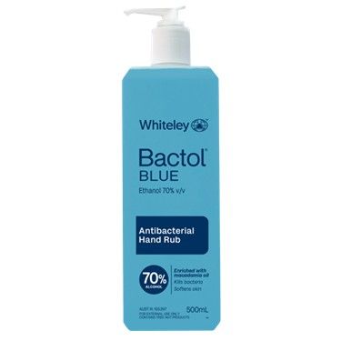 Bactol Blue is an antibacterial hand rub formulated with an alcohol concentration of 70% Ethanol v/v. It is pH balanced, leaving skin feeling soft and refreshed. Bactol Blue contains natural emollients to maintain skin integrity and prevent moisture loss.