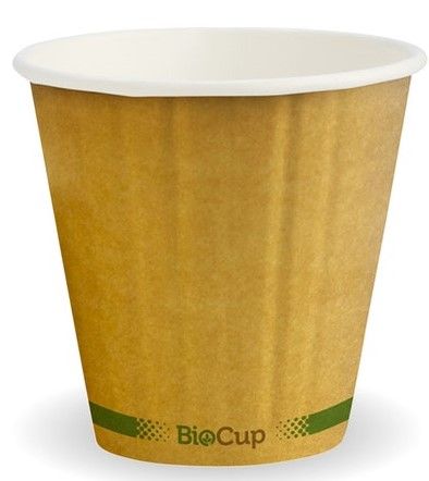 Paper Double Wall BioCups are lined with a water-based aqueous coating and certified home compostable (AS5810). This 8oz(90mm) Green Stripe BioCup is printed kraft-look. This takeaway cup fits our large lids